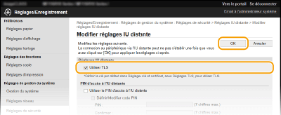 Utilisation du panneau de commandeVous pouvez également activer ou désactiver le cryptage TLS à partir de <Menu>, dans l'écran Accueil. <Utiliser TLS>Démarrage de l'IU distante avec TLSSi vous essayez de démarrer l'IU distante lorsque TLS est activé, une alerte de sécurité concernant le certificat de sécurité peut apparaître à l'écran. Si tel est le cas, vérifiez l'URL saisie dans le champ d'adresse et poursuivez la procédure pour afficher l'écran de l'IU distante. Démarrage de l'IU distante |