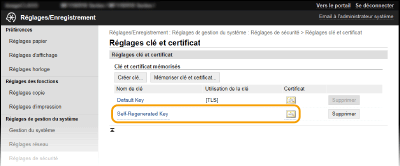 Il est impossible de supprimer une clé avec certificat en cours d'utilisation pour une fonction, comme par exemple lorsque "[TLS]" s'affiche sous [Utilisation de la clé]. Dans un tel cas, désactivez la fonction ou remplacez la clé avec certificat avant de la supprimer.