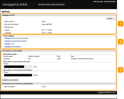 Vous pouvez afficher l'écran pour AirPrint, dans lequel vous avez accès non seulement aux réglages AirPrint, mais aussi aux informations sur les consommables tels que le papier et la cartouche de toner, etc. En outre, vous pouvez configurer les paramètres de la fonction de sécurité.