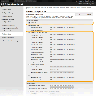 Adresse manuelle | Adresse saisie manuellement. Lorsque vous utilisez cette adresse, indiquez la longueur du préfixe et l'adresse du routeur par défaut. |