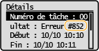 Si une erreur survient, par exemple si l'impression échoue , un code d'erreur à trois chiffres s'affiche dans l'écran Journal des tâches. Consultez cette section pour connaître les causes et les solutions possibles pour chaque code d'erreur. Pour en savoir davantage sur l'écran Journal des tâches, consultez la section
