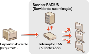 A máquina pode conectar-se a uma rede 802.1X como um dispositivo cliente. Uma rede 802.1X típica consiste de um servidor RADIUS (servidor de autenticação), interruptor LAN (autenticador) e dispositivos cliente com softwares de autenticação (suplicantes). Se um dispositivo tenta se conectar à rede 802.1X, o dispositivo deve passar pela autenticação do usuário de modo a provar que a conexão é feita por um usuário autorizado. As informações de autenticação são enviadas a e verificadas por um servidor RADIUS, que aceita ou rejeita a comunicação com a rede dependendo do resultado da autenticação. Se a autenticação falhar, um interruptor de LAN (ou um ponto de acesso) bloqueia o acesso de fora da rede.