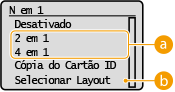 Usar <N em 1> reduz a razão de cópia automaticamente (a razão de cópia é exibida na tela). Se o processo de cópia não foi iniciado, você pode reduzir ainda mais o tamanho da imagem reduzindo o valor numérico que é exibido automaticamente. Mas as bordas do original podem não ser copiadas se aumentá-las. <N em 1> não fica disponível quando a opção <Cópia do Cartão ID> está sendo usada. Quando você copia múltiplos originais em uma página, margens podem ser criadas na imagem copiada. |