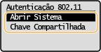 2 | Selecione um método de autenticação. ![]() <Abrir Sistema> Define a autenticação aberta do sistema, também chamada de "autenticação aberta". <Chave Compartilhada> Usa a chave WEP como senha. ![]() Quando <Abrir Sistema> está selecionado Quando você estiver se conectando a uma LAN sem fio, a máquina passa por um erro de autenticação se a chave de autenticação compartilhada estiver definida no roteador sem fio. Se isso acontecer, a máquina altera automaticamente a configuração para <Chave Compartilhada> e tenta conectar novamente. |