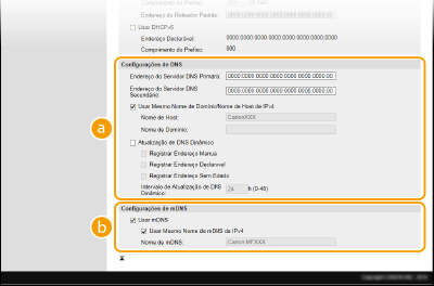 2 | Configure as definições de DNS do IPv4. ![]() [Configurações de DNS][Endereço do Servidor DNS Primário] Digite o endereço IP de um servidor DNS. [Endereço do Servidor DNS Secundário] Digite o endereço IP de um servidor DNS, se houver algum. [Nome de Host] Digite os caracteres alfanuméricos para o nome do host da máquina que será registrada no servidor DNS. [Nome de Domínio] Digite os caracteres alfanuméricos para o nome do domínio pertencente à máquina, como "example.com". [Atualização de DNS Dinâmico] Marque a caixa de seleção para atualizar dinamicamente os registros de DNS se o endereço IP da máquina for alterado. Ao especificar o intervalo entre as atualizações, insira o tempo em horas na caixa de texto [Intervalo de Atualização de DNS Dinâmico]. [Configurações de mDNS][Usar mDNS] Adotado pelo Bonjour, o mDNS (DNS multicast) é um protocolo para associar um nome de host com um endereço IP sem usar o DNS. Marque a caixa de seleção para ativar o mDNS e digite o nome mDNS na caixa de texto [Nome de mDNS]. [Configurações de Opção DHCP][Adquirir Nome de Host] Marque a caixa de seleção para ativar a Opção 12 para obter o nome de host do servidor DHCP. [Atualização de DNS Dinâmico] Marque a caixa de seleção para ativar a Opção 81 para atualizar dinamicamente os registros DNS através do servidor DHCP. |