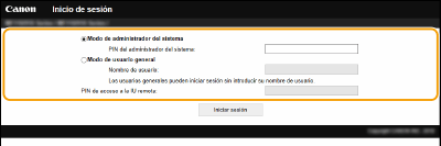 Seleccione [Modo de administrador del sistema] o [Modo de usuario general] y, a continuación, introduzca el PIN apropiado en [PIN de acceso a la IU remota] según sea necesario.