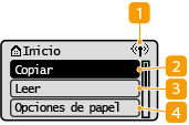 en el panel de control. Utilice esta pantalla para especificar la configuración y registrar funciones.![]() | Icono Wi-FiAparece cuando el equipo está conectado a una LAN inalámbrica. <Copiar>Utilice este elemento para iniciar la copia. Copia <Leer>Escanea un original y lo convierte en un archivo electrónico. Lectura <Opciones de papel>Este elemento se utiliza para especificar el tamaño y el tipo de papel cargado en el casete. Especificación del tamaño y tipo de papel |