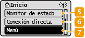 ![]() | <Monitor de estado>Seleccione este elemento para consultar el estado de impresión, para ver el historial de uso o para ver las opciones de red, como puede ser la dirección IP del equipo. Asimismo, podrá consultar el estado del equipo como, por ejemplo, la cantidad restante en el cartucho de tóner, etc. o si se ha producido algún error. Pantalla <Monitor de estado> <Conexión directa>Seleccione este elemento para conectar el dispositivo móvil y el equipo directamente sin utilizar un router de red LAN inalámbrica. Conectar directamente (Modo de punto de acceso) <Menú><Opciones de red>, <Preferencias> y muchas otras configuraciones del equipo se inician desde este elemento. Lista del menú de configuración |