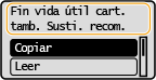 Para sustituir un consumible Pulse y mantenga presionada la tecla [Reset]. En la pantalla <Imprimir informe>, imprima el informe de estado de consumibles para averiguar el nombre del cartucho. Impresión de informes y listas |