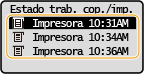 Para consultar los estados de impresión1 | <Estado de trabajos> Seleccione el documento cuyo estado desea comprobar.![]() Se muestra la información detallada del documento. |