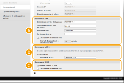 2 | Configure las opciones de DNS IPv4. ![]() [Opciones de DNS][Dirección de servidor DNS primario] Introduzca la dirección IP de un servidor DNS. [Dirección de servidor DNS secundario] Introduzca la dirección IP de un servidor DNS secundario, si existe. [Nombre de host] Introduzca caracteres alfanuméricos en el nombre de host del equipo que vaya a registrar en el servidor DNS. [Nombre de dominio] Introduzca caracteres alfanuméricos en el nombre del dominio al que pertenezca el equipo, como "example.com". [Actualización dinámica de DNS] Seleccione la casilla de verificación para actualizar dinámicamente los registros DNS cuando cambie la dirección IP del equipo. Cuando especifique el intervalo entre las actualizaciones, introduzca el tiempo en horas en el cuadro de texto [Intervalo de actualización dinámica de DNS]. [Opciones de mDNS][Usar mDNS] Adoptado por Bonjour, mDNS (DNS multidifusión) es un protocolo para relacionar un nombre de host con una dirección IP sin utilizar DNS. Seleccione la casilla de verificación para activar mDNS e introduzca el nombre de mDNS en el cuadro de texto [Nombre de mDNS]. [Opciones de DHCP][Obtener nombre de host] Seleccione la casilla de verificación para habilitar la Opción 12 y obtener el nombre de host del servidor DHCP. [Actualización dinámica de DNS] Seleccione la casilla de verificación para habilitar la Opción 81 y actualizar dinámicamente los registros DNS a través del servidor DHCP. |