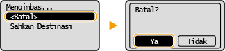 Jika anda ingin membatalkan menghantar dokumen dengan segera selepas memulakan imbasan, pilih <Batal> pada paparan dan tekan