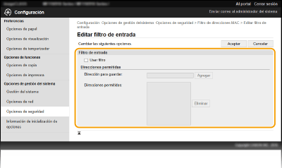 Si las direcciones MAC se introducen de forma incorrecta, es posible que no pueda acceder al equipo desde la IU remota, en cuyo caso deberá establecer <Filtro de direcciones MAC> en <Off>. <Filtro de direcciones MAC>