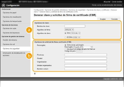 Cuando [SHA384] o [SHA512] están seleccionados en [Algoritmo de firma], [512 bits] no podrá seleccionarse como longitud de clave si está seleccionado [RSA] en [Algoritmo de clave].