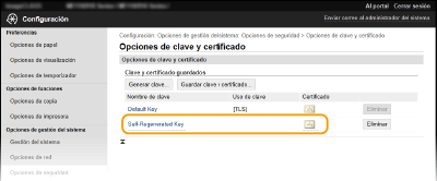 Una clave y un certificado no pueden eliminarse si se utilizan actualmente para algún fin, como cuando aparece "[TLS]" en [Uso de clave]. En este caso, deshabilite la función o sustituya la clave y el certificado antes de eliminarlos.