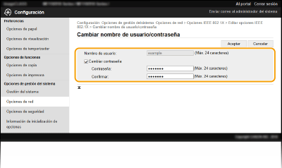 [Cambiar contraseña] Para configurar o cambiar la contraseña, seleccione la casilla de verificación e introduzca caracteres alfanuméricos para la nueva contraseña en los cuadros de texto [Contraseña] y [Confirmar].