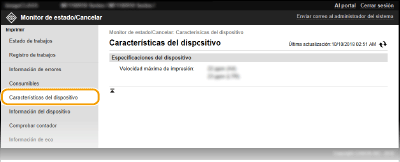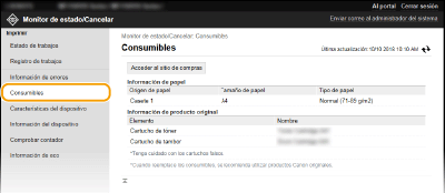 Se muestra información sobre el tamaño y el tipo de papel para el origen del papel, el número de modelo del cartucho de tóner, etc. También podrá hacer clic en [Comprobar detalles de consumibles] en la página del Portal (página principal) para mostrar esta página (