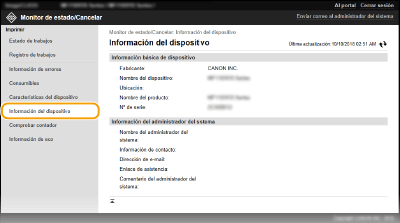 Se muestra la información sobre el equipo y el administrador del sistema. Esta información está establecida en [Gestión del sistema] en la página [Configuración].