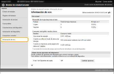 Podrá comprobar información como puede ser el número de impresiones mensuales y la cantidad de energía consumida. También podrá verificar y cambiar las opciones de copia del dispositivo para ahorrar papel y energía.