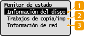 Cuando seleccione <Monitor de estado>, aparecerá una pantalla en la que podrá comprobar el progreso del procesamiento de los documentos, así como el estado del equipo (la cantidad de tóner restante en los cartuchos de tóner, etc.) e información sobre la configuración de la red, como puede ser la dirección IP del equipo.