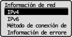 Muestra las opciones de configuración de red, como la dirección IP del equipo, así como el estado, como por ejemplo el de las comunicaciones de red inalámbrica.