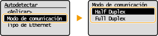 Envía y recibe datos de comunicación de forma alterna. Seleccione cuándo se conecta el equipo a un dispositivo de red utilizando Half Duplex. <Full Duplex>