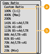 You can enlarge or reduce copies by using a preset copy ratio such as <A5->A4/LTR>, or by setting a custom copy ratio in increments of 1 %.