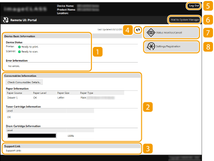 Apabila anda log masuk ke Remote UI, halaman Portal berikut muncul. Bahagian ini menerangkan item yang dipaparkan di halaman Portal dan operasi asas.