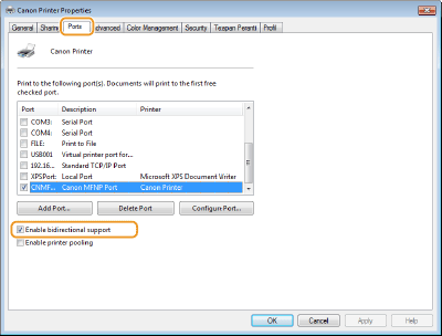 Jika anda menggunakan sambungan rangkaian dan telah menukar alamat IP mesinJika [Description] untuk port yang terpilih adalah [Canon MFNP Port] dan mesin serta komputer berada di subnet yang sama, maka sambungan akan dikekalkan. Anda tidak perlu menambah port baru. Jika ia [Standard TCP/IP Port], anda perlu menambah port baru. Mengkonfigurasi Port Pencetak