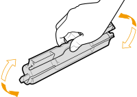 Goncangkan kartrij toner 5 atau 6 kali seperti yang ditunjukkan di bawah untuk mengagihkan sama rata toner di dalam kartrij, dan kemudian letakkannya di atas permukaan rata.