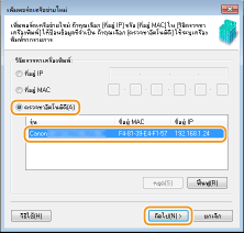 คลิก [ฟื้นฟู] หากยังพบปัญหา เลือก [ที่อยู่ IP] หรือ [ที่อยู่ MAC] ใส่ที่อยู่ IP หรือที่อยู่ MAC ของเครื่อง (การตรวจดูการตั้งค่าเครือข่าย) จากนั้นคลิก [ถัดไป]