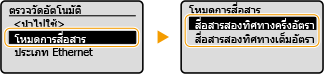 Ethernet เป็นมาตรฐานสำหรับสื่อสารข้อมูลในเครือข่ายเฉพาะที่ (LAN) คุณสามารถตั้งค่าโหมดการสื่อสารและประเภท Ethernet ซึ่งโดยทั่วไปแล้ว เครื่องสามารถใช้งานได้โดยไม่ต้องเปลี่ยนแปลงค่าเริ่มต้น (<การตั้งค่าไดรเวอร์ Ethernet>) แต่คุณสามารถเปลี่ยนแปลงการตั้งค่าเหล่านี้ให้เหมาะกับสภาพแวดล้อมเครือข่ายของคุณ