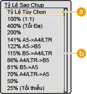 Bạn có thể phóng to hoặc thu nhỏ bản sao bằng cách sử dụng tỷ lệ sao chụp cài đặt sẵn như <A5->A4/LTR>, hoặc bằng cách cài đặt tỷ lệ sao chụp tuỳ chọn với đơn vị tăng giảm là 1%.