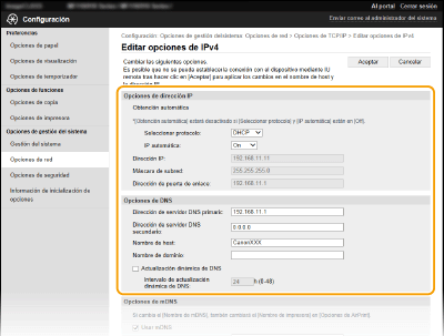 Puede cambiar las distintas opciones del equipo utilizando la IU remota. La mayoría de las opciones también pueden configurarse en el equipo, pero algunas opciones solo pueden configurarse a través de la IU remota. En esta sección se describe el flujo básico de cambio de las opciones del equipo a través de la IU remota.