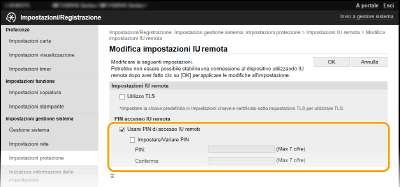 Selezionare la casella di controllo [Usare PIN di accesso IU remota] e impostare il PIN.