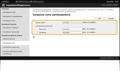 [Variazione password] Per impostare o modificare la password, selezionare la casella di controllo e immettere dei caratteri alfanumerici per la nuova password nelle caselle di testo [Password] e [Conferma].