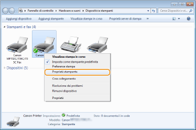 Fare clic con il pulsante destro del mouse sull'icona del driver della stampante per questa macchina, quindi fare clic su [Proprietà stampante] o [Proprietà].