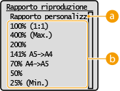 È possibile ingrandire o ridurre le copie utilizzando un rapporto di riproduzione predefinito come <A5->A4> o impostando un rapporto di riproduzione personalizzato con incrementi dell'1 %.