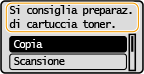 Quando la quantità di toner in una cartuccia toner è scarsa, la macchina visualizza un messaggio. Tenere presente che la qualità di stampa diminuisce se si continua a stampare senza prendere provvedimenti. È possibile controllare sul display il livello di toner residuo nelle cartucce toner (