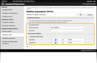 Se si cambia il [Nome stampante] specificato in precedenza, potrebbe non essere più possibile stampare dal Mac utilizzato per stampare fino a quel momento. Questo fenomeno si verifica perché viene cambiato automaticamente anche il [Nome mDNS] (Configurazione DNS) di IPv4. In questo caso, aggiungere nuovamente la macchina al Mac.