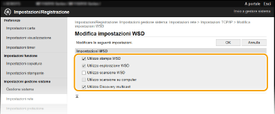 Selezionare la casella di controllo per ottenere informazioni sulla macchina da un computer tramite WSD. La casella di controllo viene selezionata automaticamente quando la casella di controllo [Utilizzo stampa WSD] è selezionata. [Utilizzo scansione WSD]
