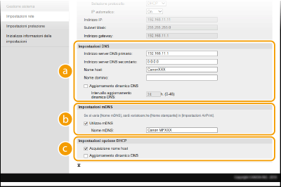 Selezionare la casella di controllo per aggiornare dinamicamente i record DNS qualora cambi l'indirizzo IP della macchina. Quando si specifica l'intervallo tra gli aggiornamenti, specificare il tempo in ore nella casella di testo [Intervallo aggiornamento dinamico DNS]. [Impostazioni mDNS][Utilizzo mDNS]