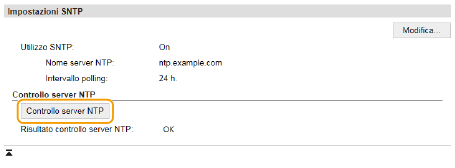 È possibile visualizzare lo stato della comunicazione con il server registrato facendo clic su [Impostazioni/Registrazione]  [Impostazioni rete]  [Impostazioni TCP/IP]  [Controllo server NTP] in [Impostazioni SNTP]. Se la connessione è stata stabilita correttamente, il risultato viene visualizzato come illustrato di seguito. Tenere presente che questa operazione non regola l'orologio di sistema.