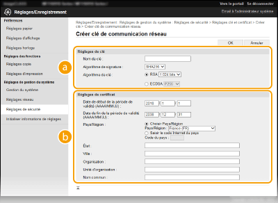 Lorsque [SHA384] ou [SHA512] est sélectionné dans [Algorithme de signature], [512 bits] ne peut pas être sélectionné en guise de longueur de clé, si [RSA] est sélectionné dans [Algorithme de clé].