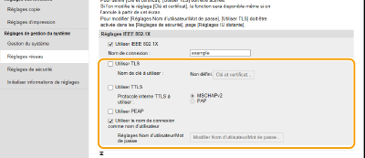 Les réglages nécessaires sont pratiquement identiques à ceux de la méthode TTLS. MSCHAPv2 est utilisé comme protocole interne. Activez TLS pour l'IU distante avant de configurer ce mode d'authentification (