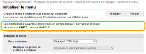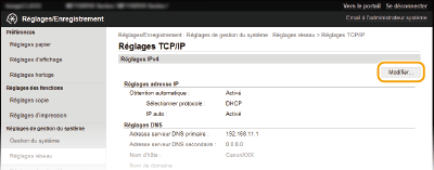 Vous pouvez modifier les réglages de l'appareil par le biais de l'IU distante. Il est possible de configurer la plupart des réglages au niveau de l'appareil lui-même, mais certains d'entre-eux doivent être modifiés par l'IU distante. Cette section décrit la procédure générale pour modifier les réglages de l'appareil depuis l'IU distante.