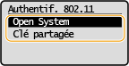 Lorsque vous connectez un réseau local sans fil, l'appareil peut être confronté à une erreur d'authentification si l'authentification de type clé partagée est définie sur le routeur sans fil. Si cela se produit, l'appareil modifie automatiquement le réglage, sélectionne <Clé partagée> et retente la connexion.