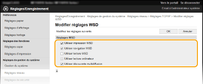 Cochez la case pour obtenir des informations sur l'appareil à partir d'un ordinateur via WSD. Cette case est automatiquement cochée lorsque la case [Utiliser impression WSD] est cochée. [Utiliser lecture WSD]