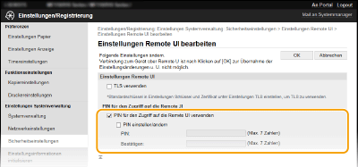 Wenn Sie dieses Kontrollkästchen aktivieren, müssen Sie eine PIN für den Zugriff auf Remote UI eingeben.