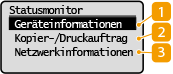 Wenn Sie <Statusmonitor> wählen, wird ein Bildschirm angezeigt, auf dem Sie den Fortschritt der Dokumentenverarbeitung sowie den Status des Geräts (die Menge des in der Tonerpatrone verbliebenen Toners usw.) und die Netzwerkeinstellungen, wie beispielsweise die IP-Adresse des Geräts, überprüfen können.